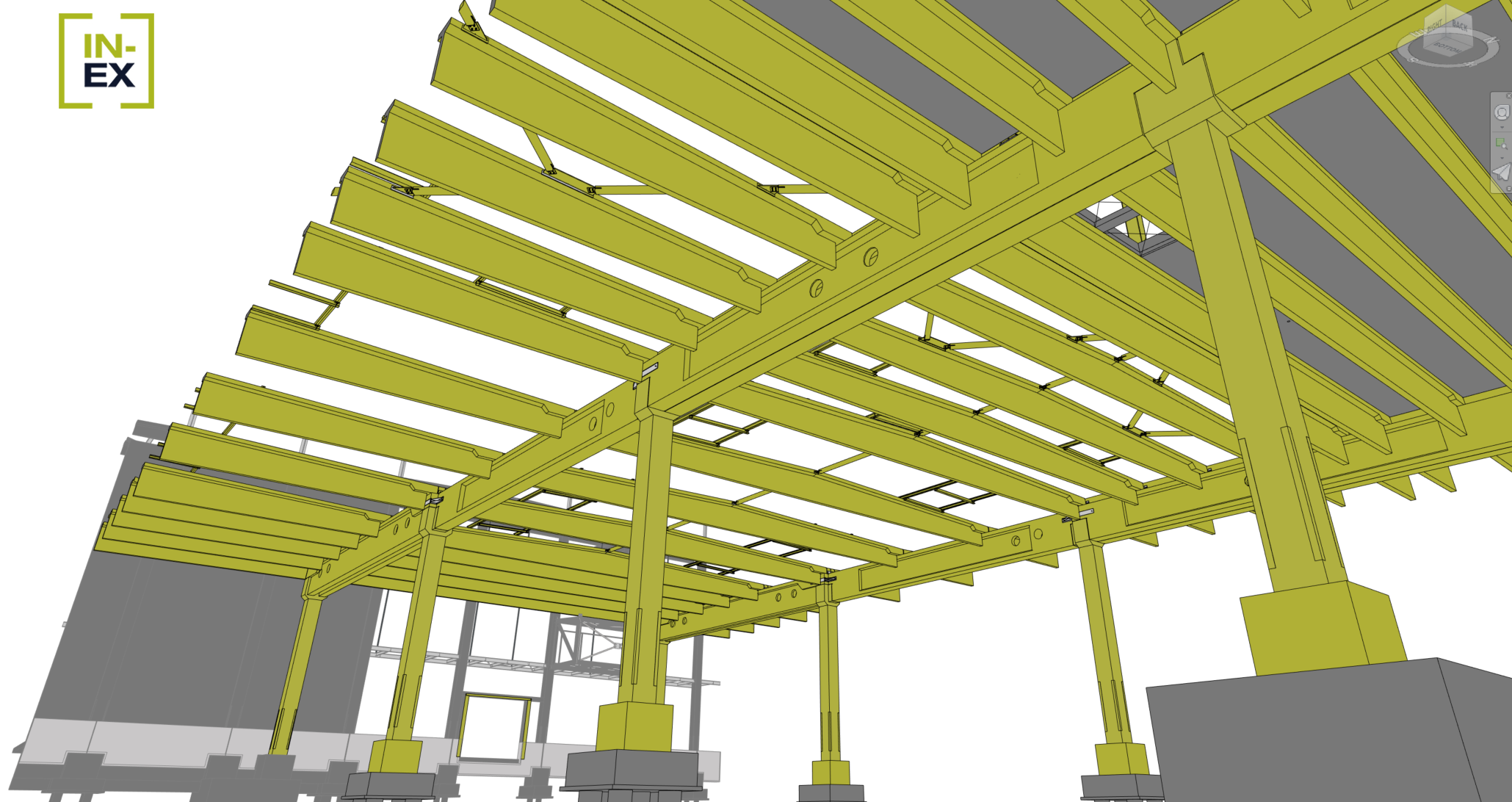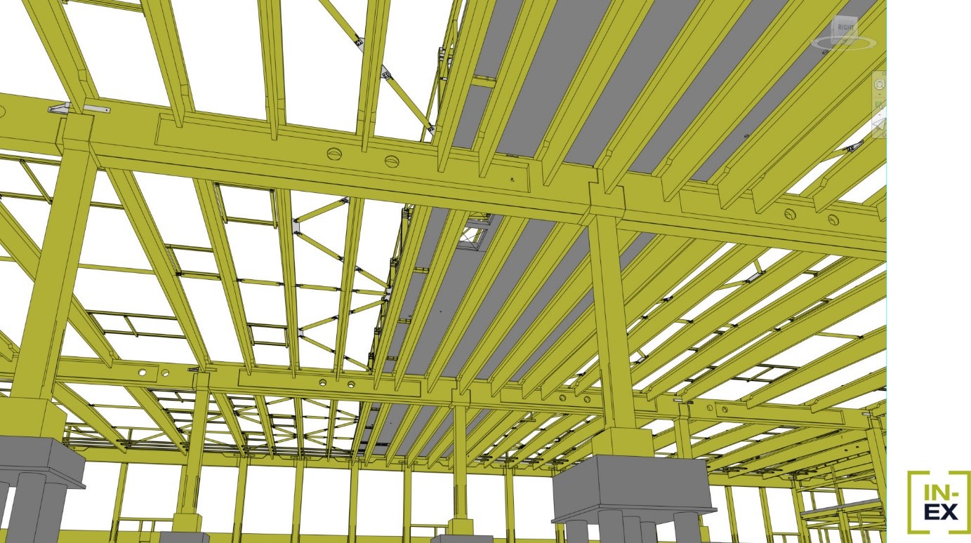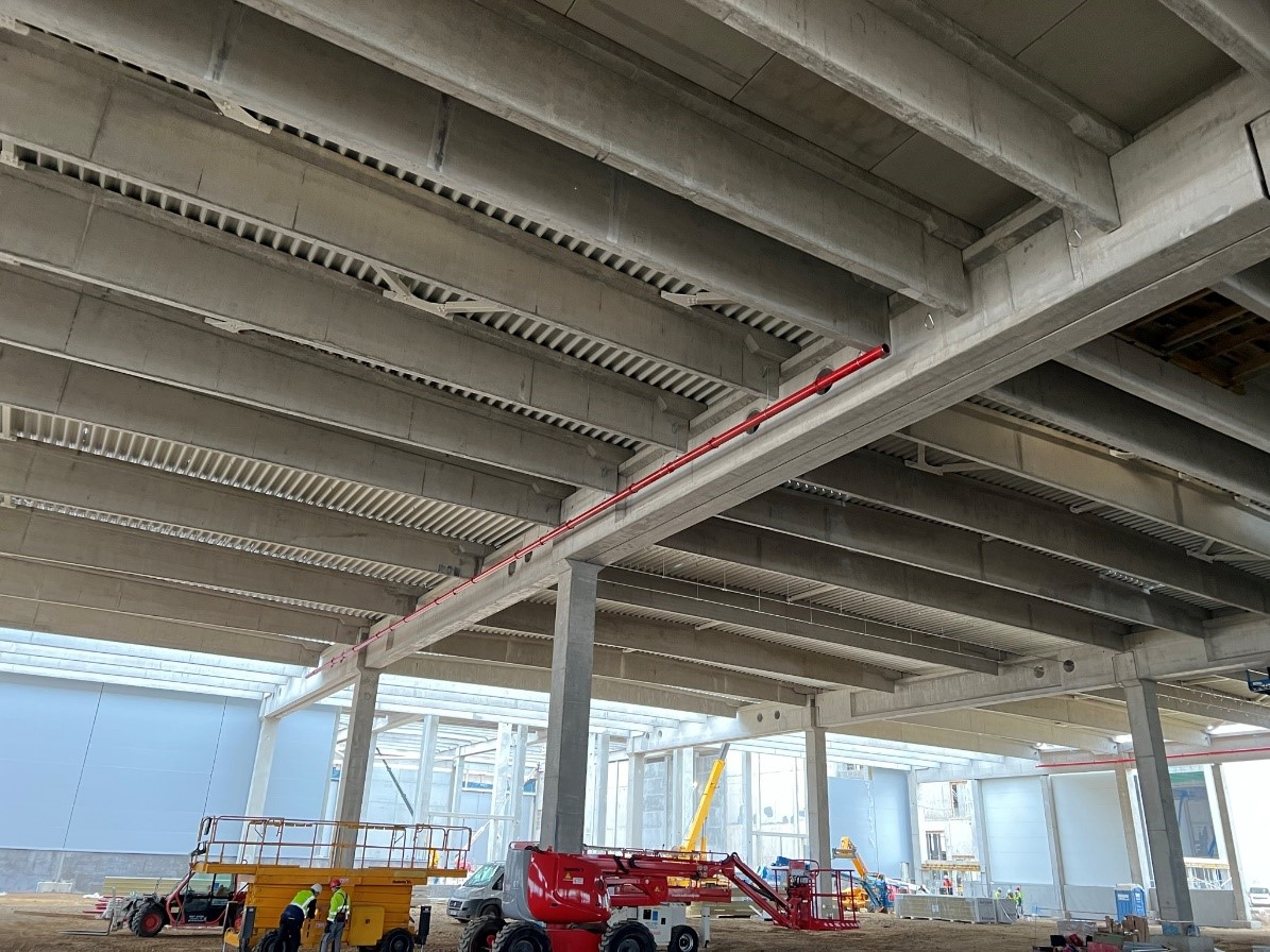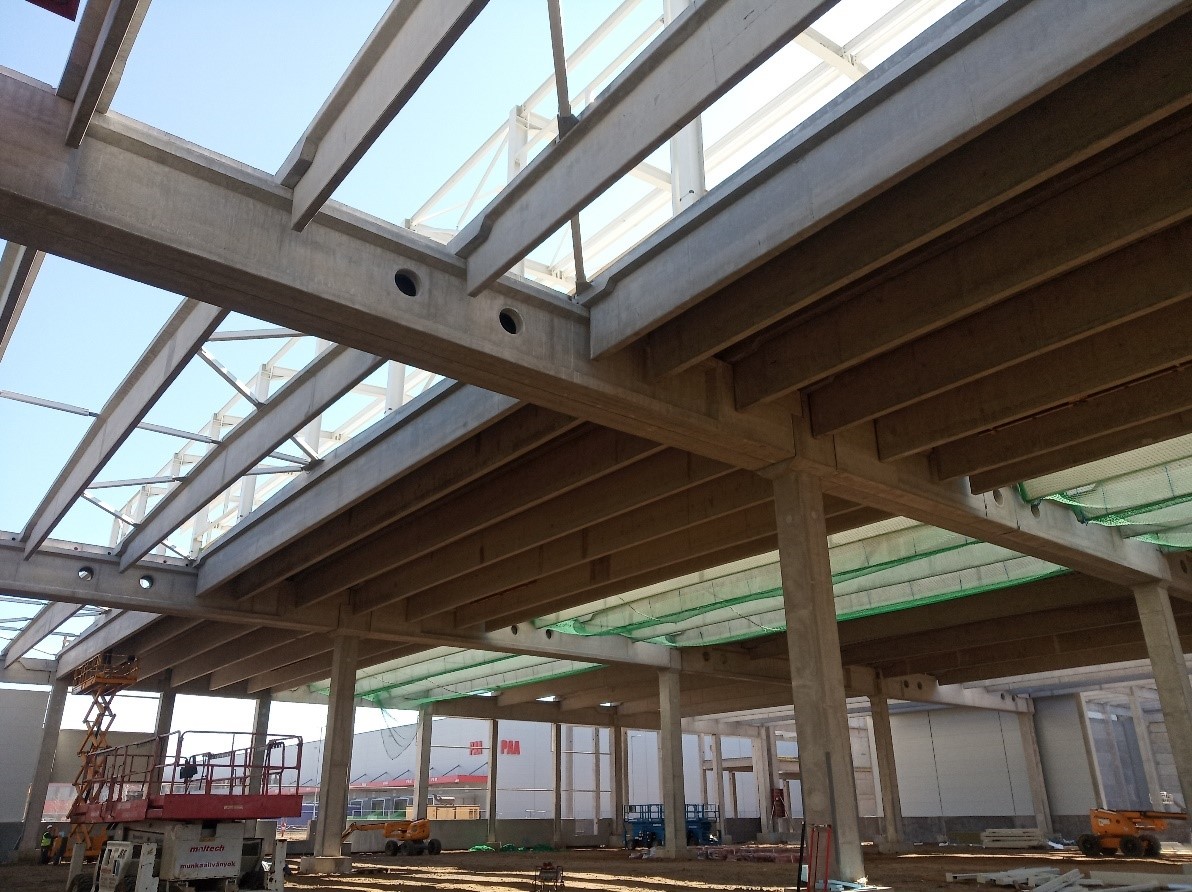 IIt was a real challenge for our structural engineers: The building is a precast reinforced concrete frame structure with pile foundations. The service headquarters was also built with a prefabricated frame slab floor consisting of hollow core slabs. The main vertical load-bearing element of the structure are the 75x75cm columns, which are supported by 120cm high prefabricated pocket necks, which also stiffen the hall in the horizontal direction. The roof structure consists of a series of 150cm high spine purlins with a span of 26.5m-23.8m-26.5m and 165cm high main beams with a span of 18.0m.