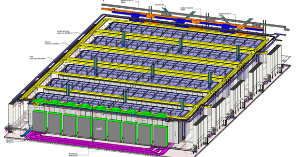 Az adatközpontok szerverek százait vagy akár ezreit magukba foglaló csarnokai tervezésekor szintén a hűtés az egyik fő szempont. A fenti képen látható egy szerver csarnok , ahol középzén húzódnak a rack-ek a terem jobb és baloldalán a hideglevegő befújásáért felelős CRAC (Computer Room Air Conditioning) egységek, a terem másik két oldalán pedig az elektromos elosztók (PDU – Power Distribution Unit).