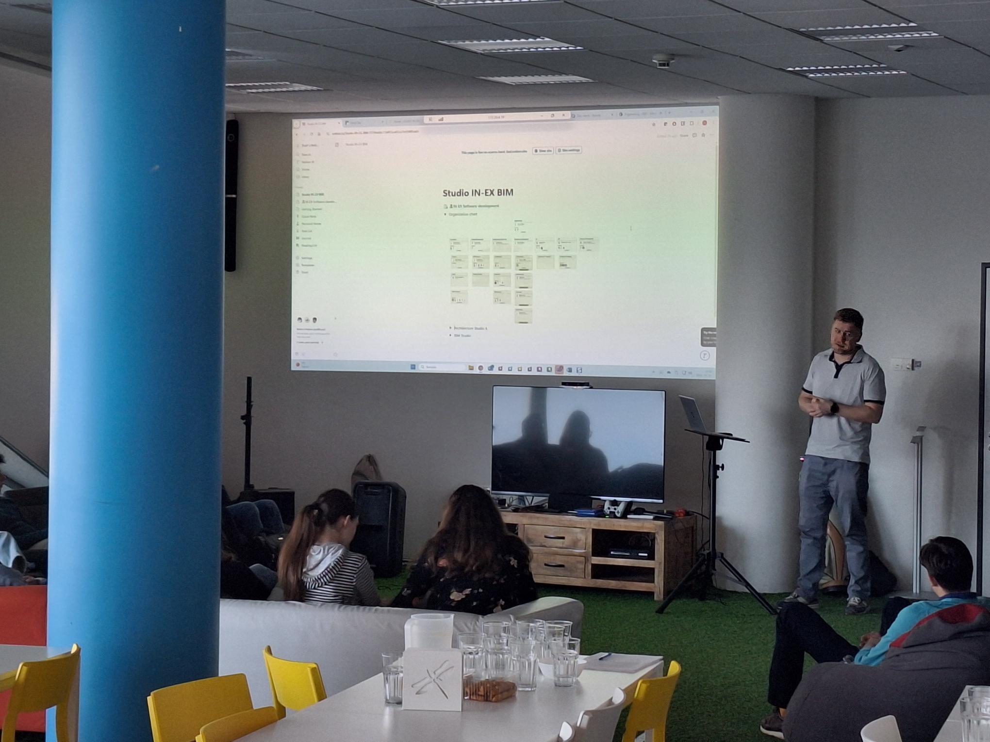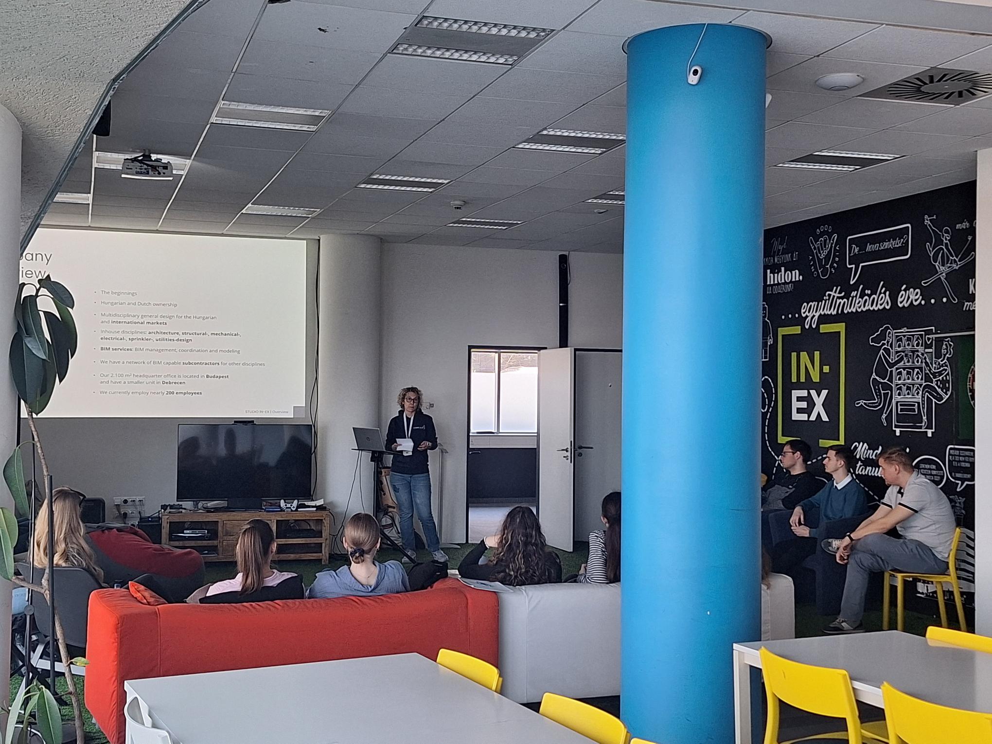 The programme started with a brief tour of the office and its operations, during which Andrea Bányász and Zsolt Oláh showed the students around. The students were introduced to the organisational structure of STUDIO IN-EX and how professionals from different fields work together. Andrea Bányász then gave a detailed presentation of the company’s operations, describing the studios, the positions and the projects conducted by the company. The students were given an insight into the wide range of tasks that designers and engineers face in their daily work.