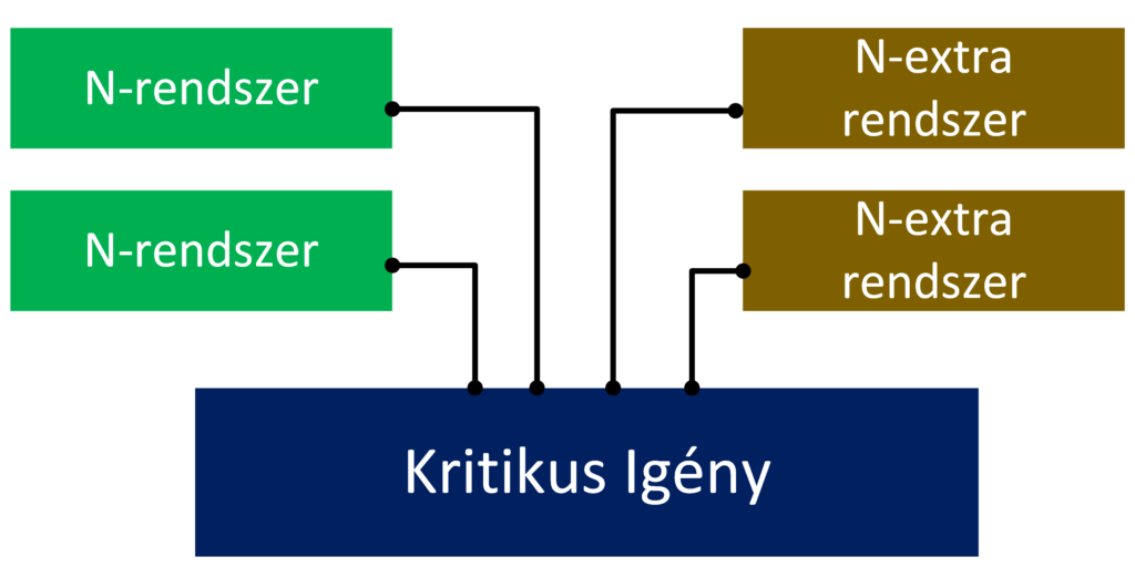 N redundancia: A redundancia mértékét hivatott megmutatni, tehát több komponenst használunk párhuzamosan, így ha az egyik komponensünk meghibásodik, vagy kiesik, akkor a másik át tudja venni a helyét. N jelöli a normál üzemhez szükséges eszközök/betáplálások számát.