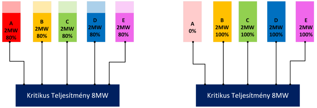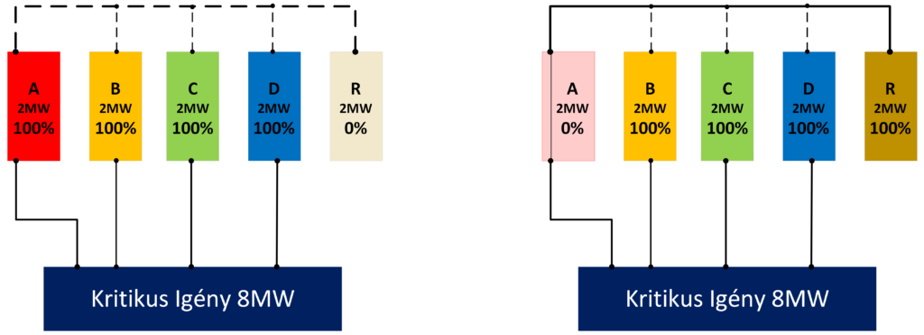 Ez magában még nem hibabiztos, úgy tehetjük azzá, ha az összteljesítményt másképpen osztjuk szét. Megoldás lényege, hogy egy extra, ugyanolyan teljesítményű blokkot alkalmazunk, és szétosztjuk a teljes kritikus rendszert. Így egyetlen kiszolgáló rendszer sem fog névleges teljesítményen dolgozni, így egy hiba esetén a többi rendszer még át tudja venni a kieső teljesítmény igényét.