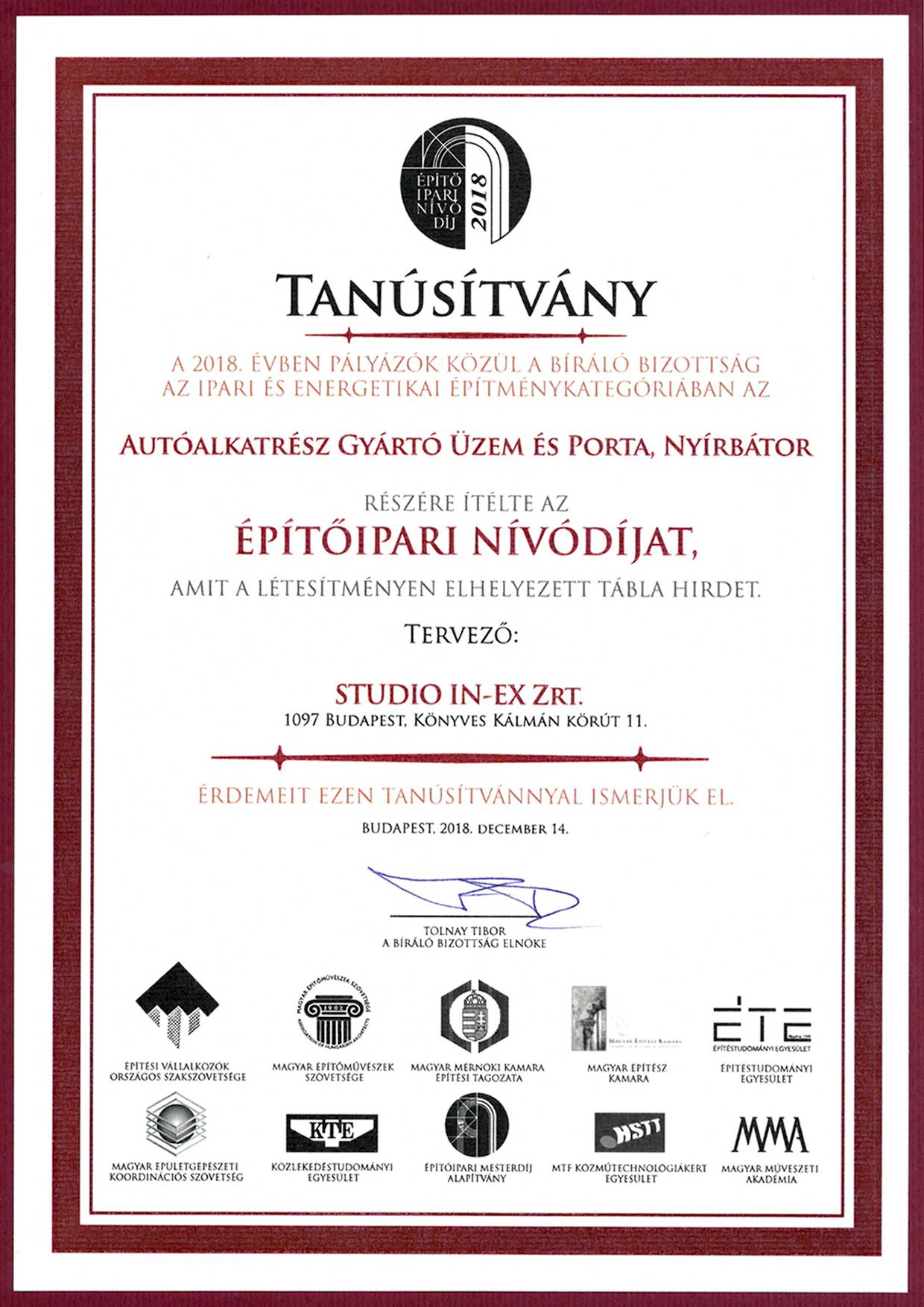A STUDIO IN-EX tervezésével épült a Rosenberger új autóipari és híradástechnikai kábelszerelő üzeme Nyírbátorban, amely Építőipari Nívódíjat nyert.