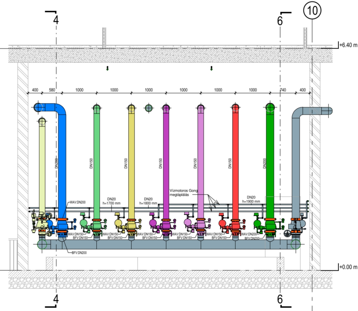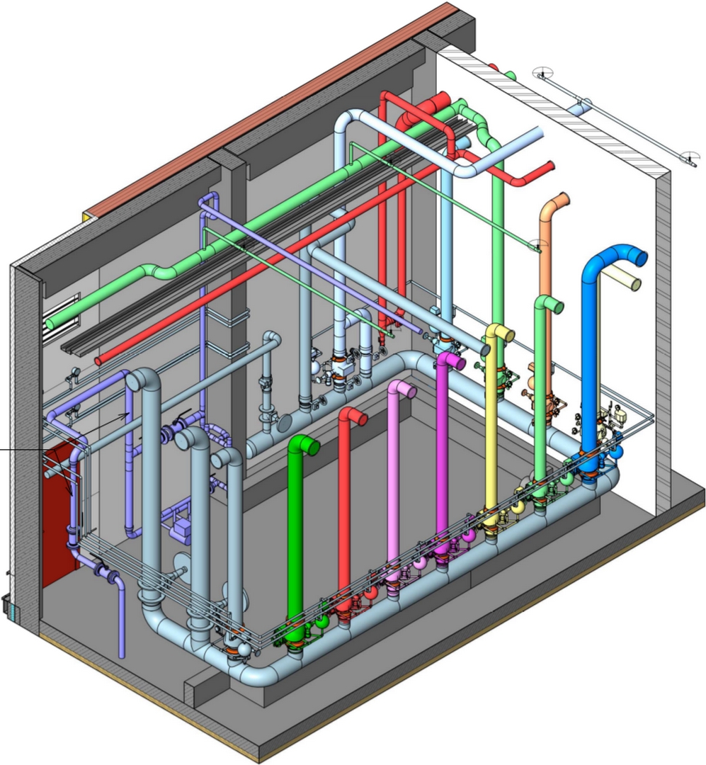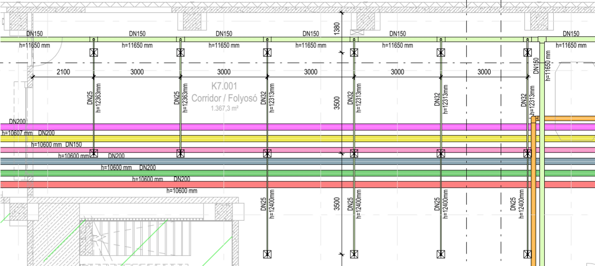 Számunkra a closed BIM-ben való munka, valamint az, hogy a beépített oltórendszer tervező, az épületgépész és elektromos szakágak mindössze néhány asztalnyi távolságra dolgoznak egymástól irodánkon belül, nagyban megkönnyítik e törekvésünk realizálását. Szakmai tapasztalatunk a sprinkler rendszerek BIM-ben történő tervezésében – melyet 2016. óta végzünk – kimagasló szintű Magyarországon. Terveinket kizárólag Revitben készítjük, ez alól a kapcsolási rajzok sem kivételek. Modellezési sajátosságunk, hogy az egyes rendszereket külön-külön színjelöléssel látjuk el, melyek következetesen megjelennek a Revit modellben, a kivitelezésre exportált modellben, a zónarajzon, a kapcsolási rajzon, a gépház és alközpont tervlapokon is, így bármely csőszakaszról az épület bármely pontján egyértelműen megállapítható mely rendszerhez tartozik. Az általunk készített tervek ezáltal könnyebben értelmezhetők a kivitelezők, a tervellenőrök, a műszaki ellenőrök, valamint a Katasztrófavédelem szakemberei számára egyaránt.