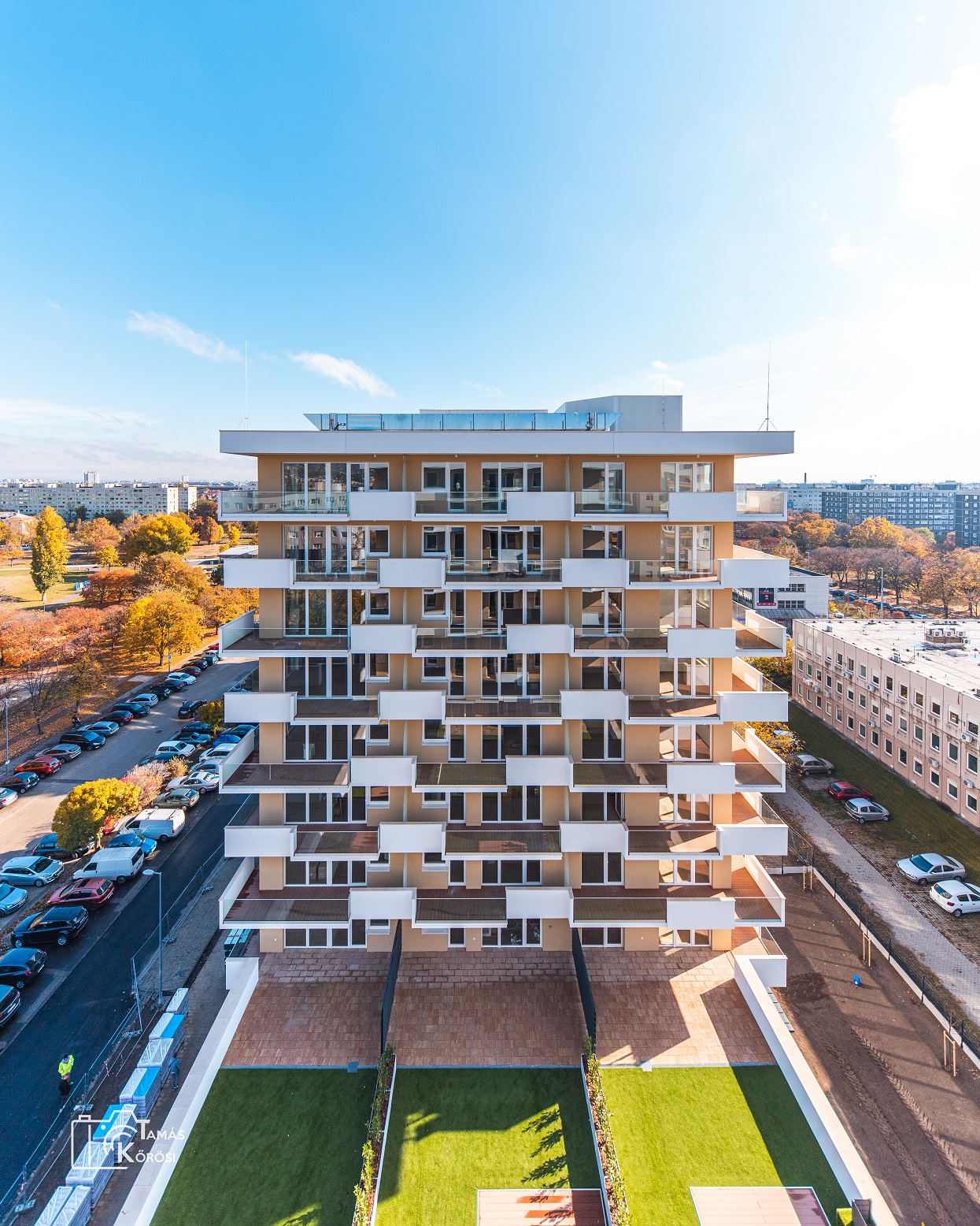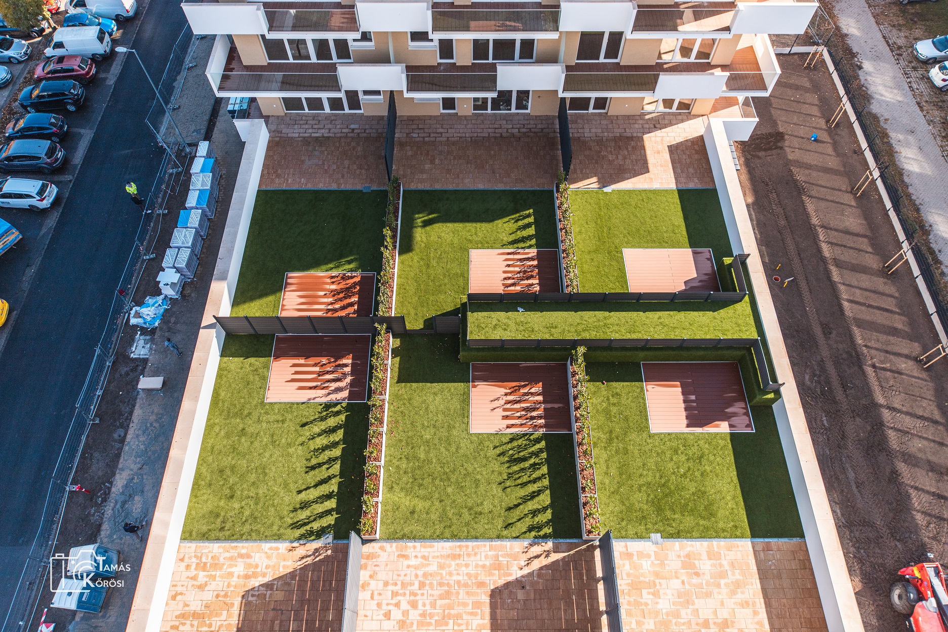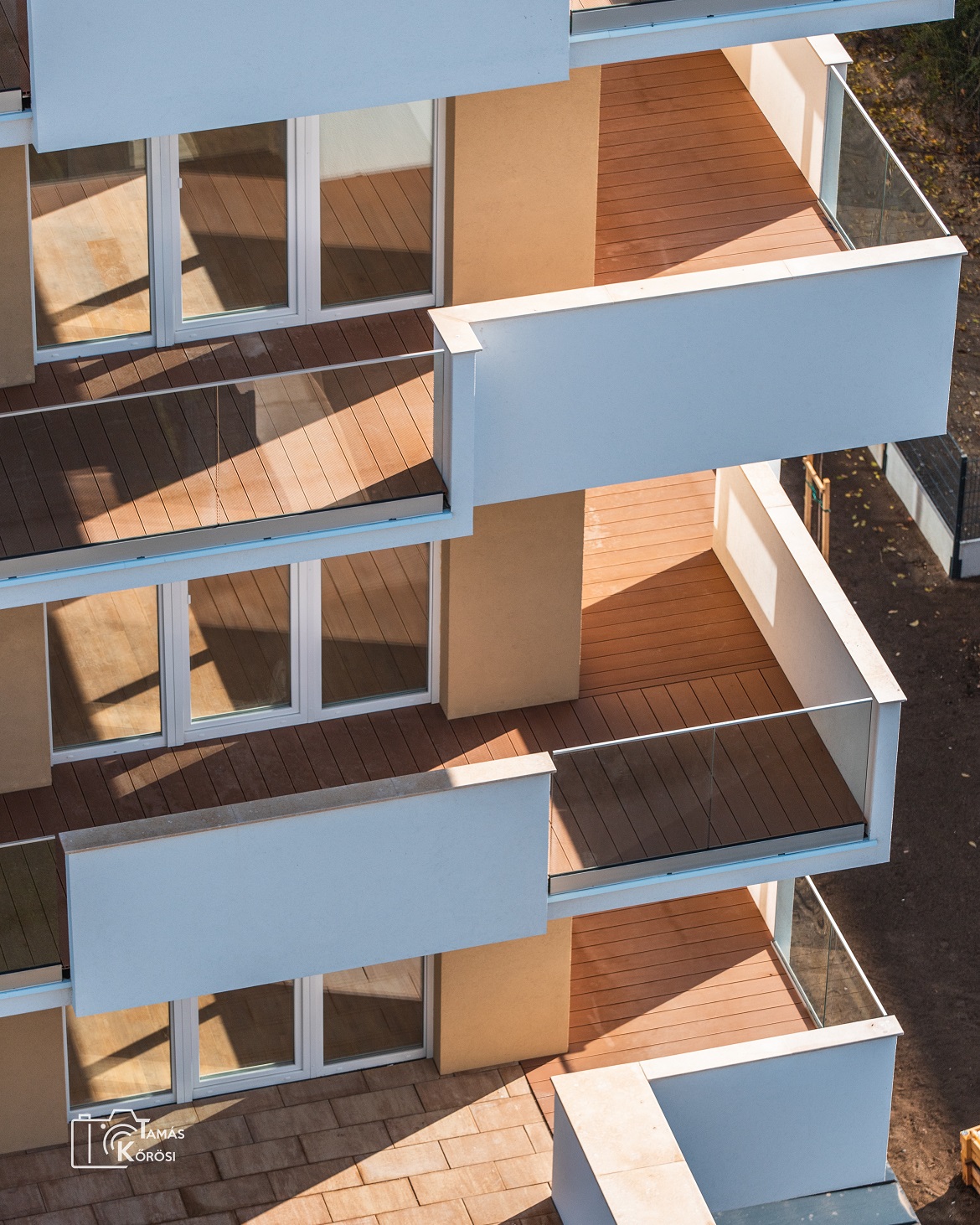 Elérkezett az utolsó simításokig a Vahot utcai társasház projektünk, ahol már a kivitelezés befejező munkálatai zajlanak. Ottjártunkkor először láthattuk elkészült állapotban a második emeleti lakások tetőteraszait és a lakótornyok erkélyekeit. Bár a teraszok műfüves borítása főként fenntartási okokból nem lett végül természetes kialakítású, így is oldani tudja az épület monoton megjelenését, és kellemesebb látvány tárul a majdani lakók elé, még ha kissé kontrasztban is áll a háttérben lassan őszülő Bikás parkkal.